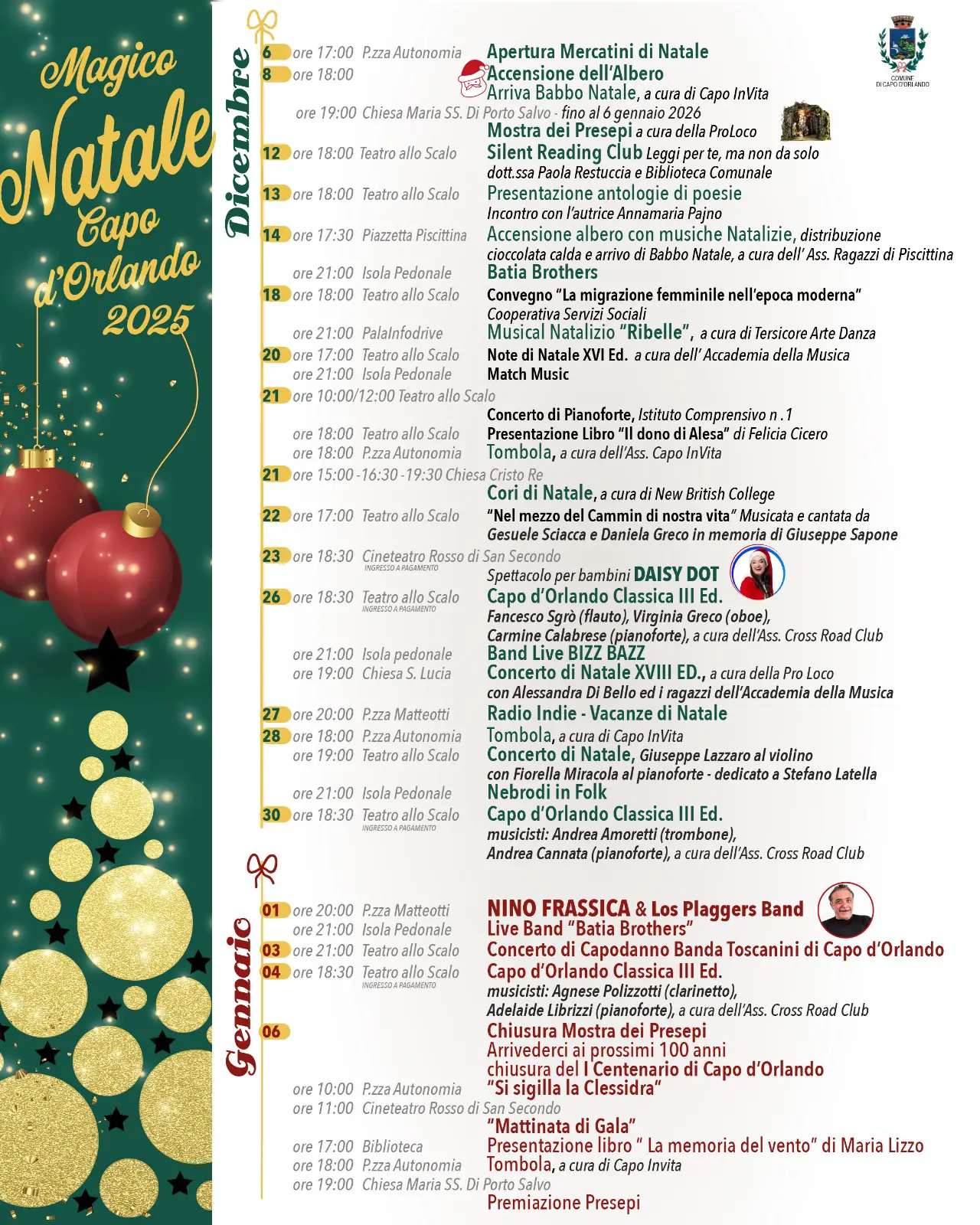 Di seguito i momenti più significativi del calendario del Natale a Capo d’Orlando 2025 (tutti gli orari sono indicativi e possono essere soggetti a variazioni):