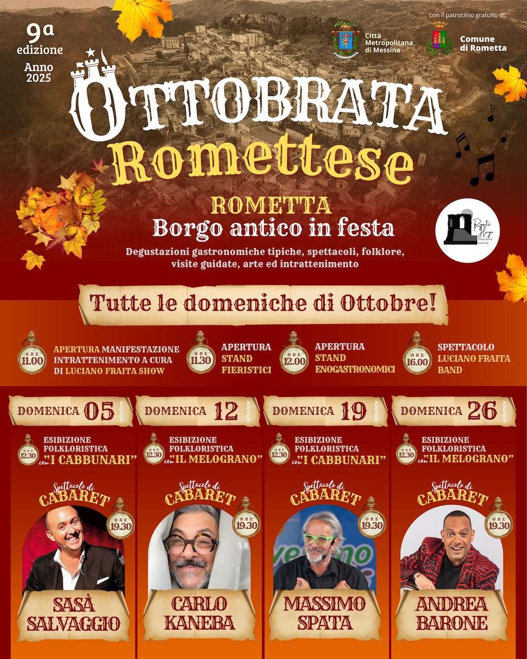 L’autunno porta con sé sapori, tradizioni e feste popolari: questo è il clima che anima ogni anno l’evento “Ottobrata Romettese” nel borgo di Rometta, in provincia di Messina. La 9ª edizione del festival si svolgerà tutte le domeniche di ottobre — 5, 12, 19 e 26 ottobre 2025 — a partire dalle ore 11:00 nel suggestivo centro storico di Rometta.